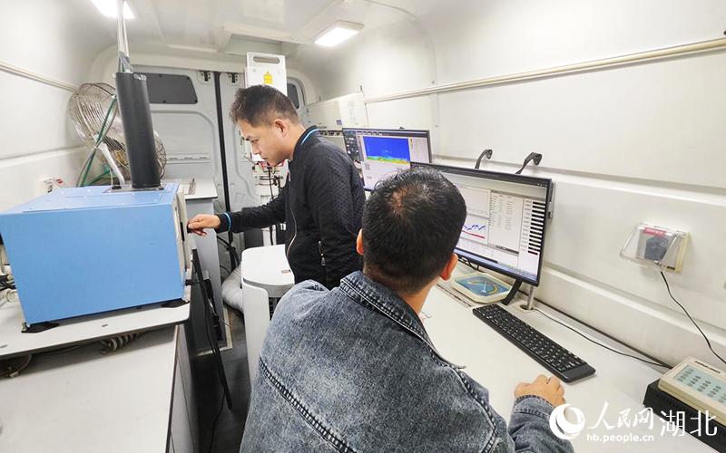 走航監(jiān)測(cè)車內(nèi),工作人員正在分析監(jiān)測(cè)數(shù)據(jù)。人民網(wǎng)記者 王郭驥攝
