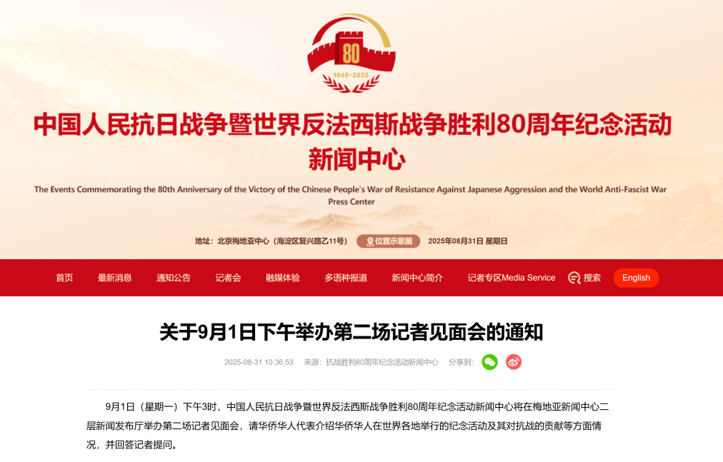 抗戰(zhàn)勝利80周年紀(jì)念活動新聞中心將于9月1日下午舉辦第二場記者見面會