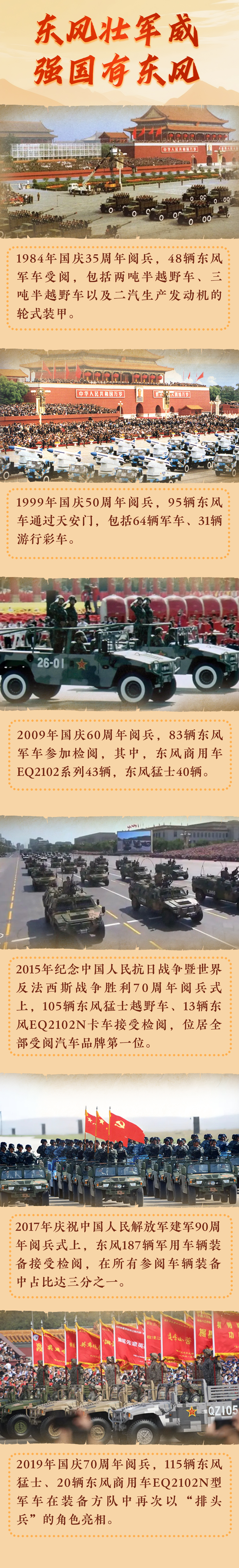 東風(fēng)因軍而建、因軍而興、因軍而榮。在過去的四十多年,東風(fēng)軍車已經(jīng)6次光榮接受黨和人民檢閱,創(chuàng)造著“零失誤、零誤差、零故障、零事故”的傳奇紀錄。